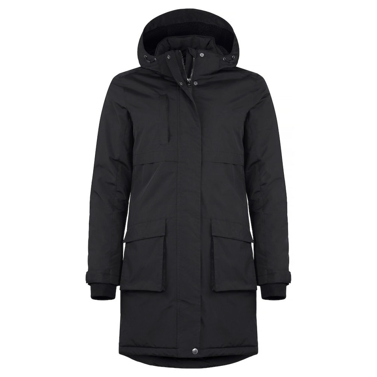 Een gewatteerde damesparka die bescherming biedt tegen wind en water. De parka is afgewerkt met een afneembare en verstelbare capuchon gevoerd met een zachte teddystof, een gewatteerde binnenkant en een trekkoord in de taille en zoom. De borstzak met ritssluiting, twee voorzakken met een magneetsluiting, twee binnenzakken met rits en twee mesh binnenzakken bieden voldoende opbergruimte. De manchetten zijn verstelbaar met klittenband en hebben een 2x2 rib in de mouw. De parka heeft een doorvoer voor een koptelefoon en is dankzij de borduurrits eenvoudig te veredelen. De stijl van deze parka sluit perfect aan bij de Creston of de Eskie.